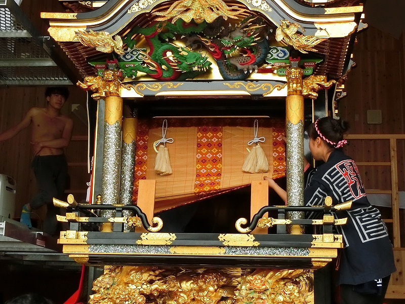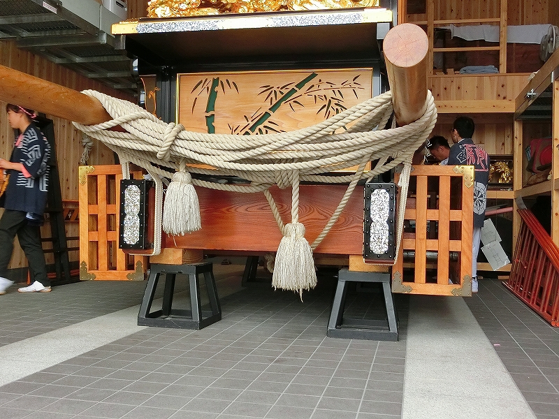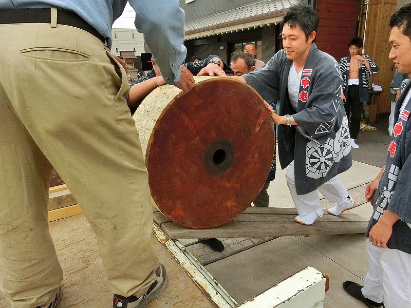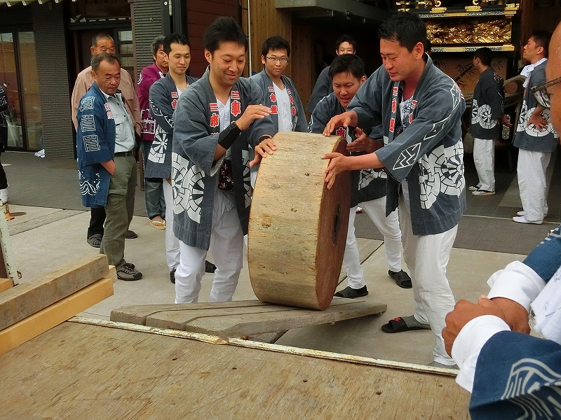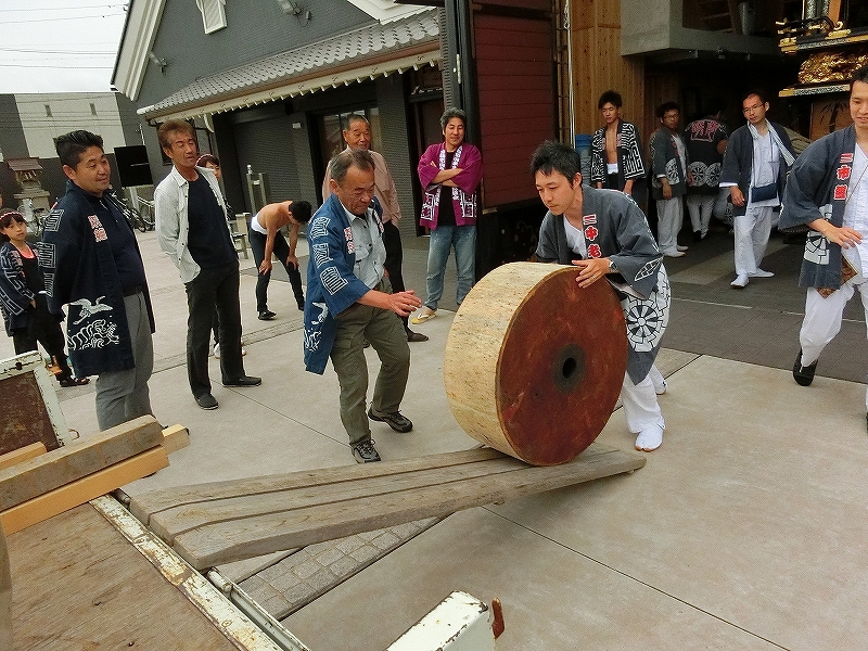 楫棒を担いで山車を持ち上げ、ウマを噛ませます。