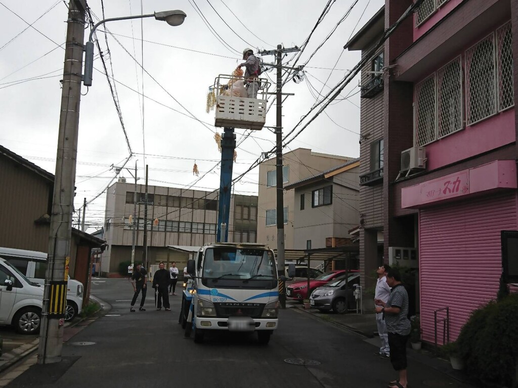 空中作業車を使い、道検分を兼ねた電線モール付けも主に各青年会を中心に行われます。