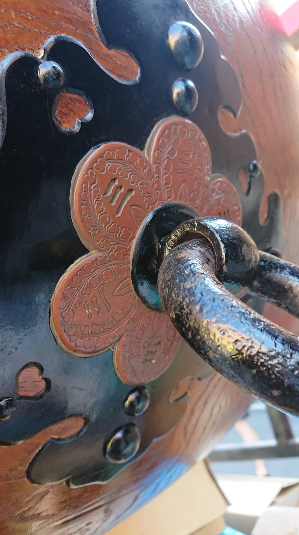 太鼓金具には、神紋の上り藤に三が入っています。