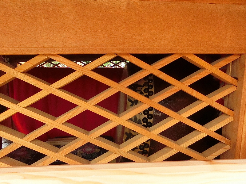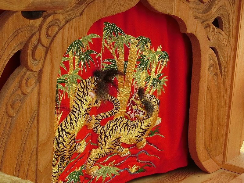 下部の正面は火灯窓で、笹竹に虎の刺繍幕があります。