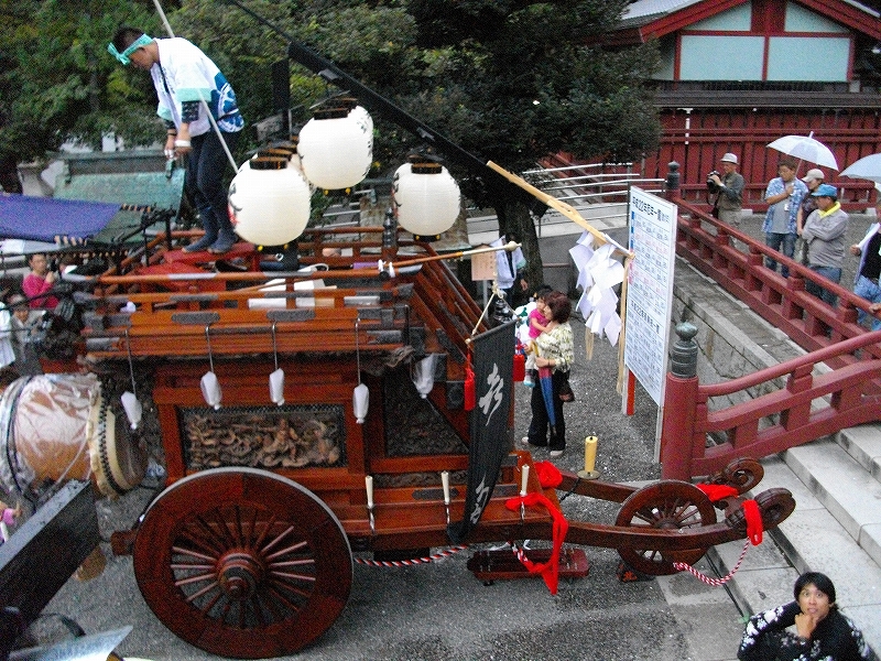(鳥居祭で山形六張を付けた羽衣祭車、江戸町祭車)