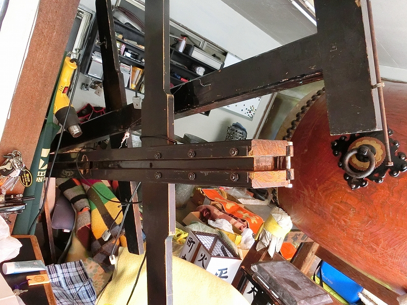 祭車を遠くから見て目立つ部分で、町名などが入った提燈を吊るす柱を二階床板と祭車内部の2ヶ所の穴に差し込みます。