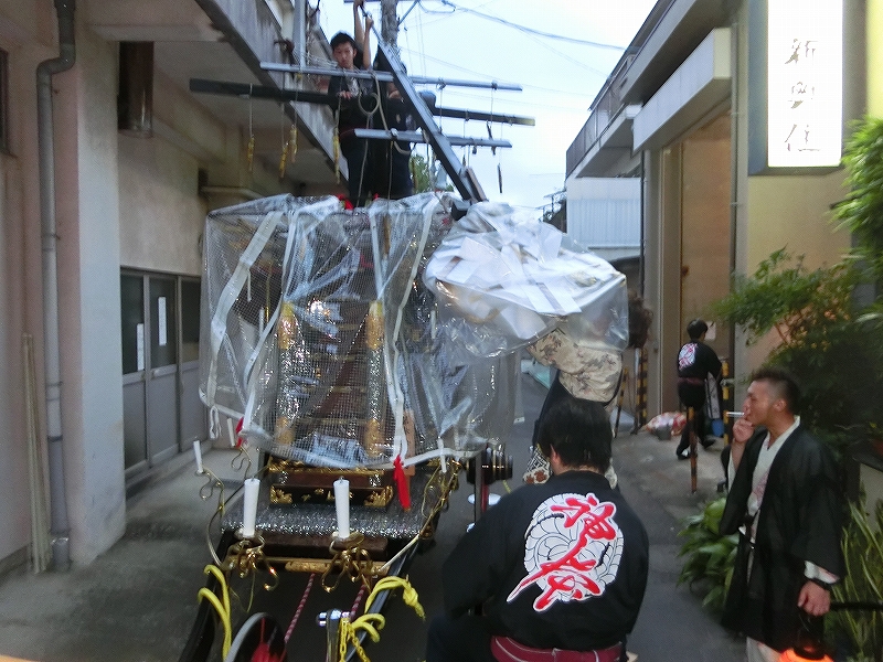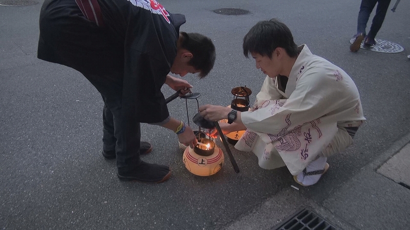 氏子町は青年会長から、遠い町は祭事委員から各町役提燈や祭車へと火を移します。