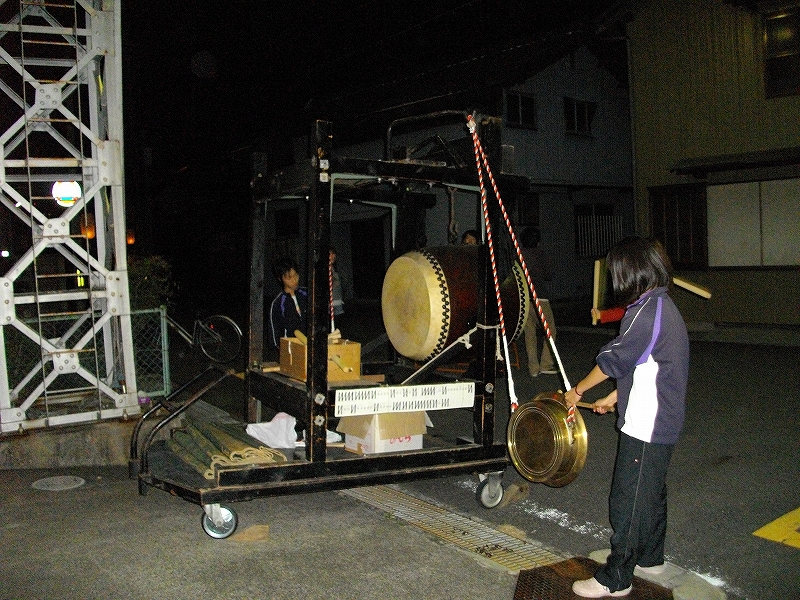 四本柱を立てた枠組みに、鉦と太鼓を取り付けます。