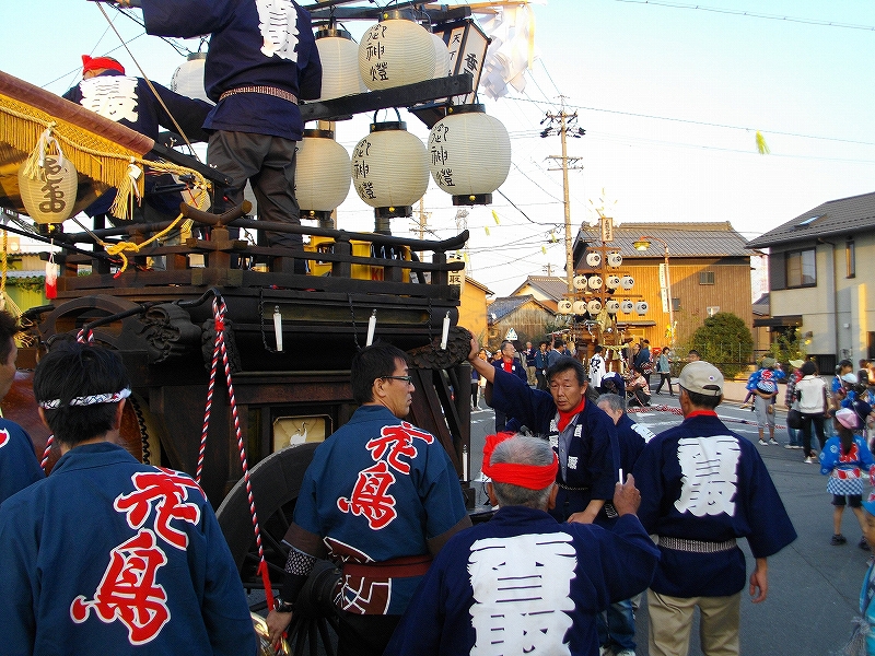 山の神(祭車庫付近)で再び本祭車も曳き出され、叩出に北組を廻った本祭車は南組、南組を廻った新祭車は北組へと祭車を交換します。